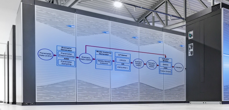 Researchers recently used JUWELS to analyze 11,000 different scenarios for the German energy system. The team wants to give decision makers insights into how different decsions regarding energy policy can impact greenhouse gas emissions, energy availability, and other metrics. Image credit: Karl-Kiên Cao, DLR.