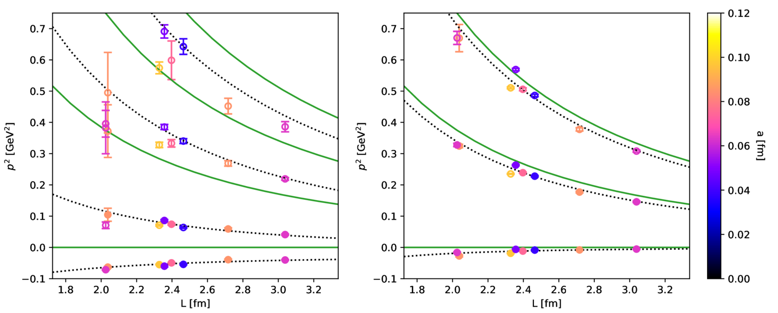 Figure 2: Finite-volume energy levels of Dπ systems. Left: flavour symmetry antitriplet; right: flavour symmetry sextet. The green curves show the energy levels in the absence of interactions and the dashed curves show a rough fit using finite-volume quantization..