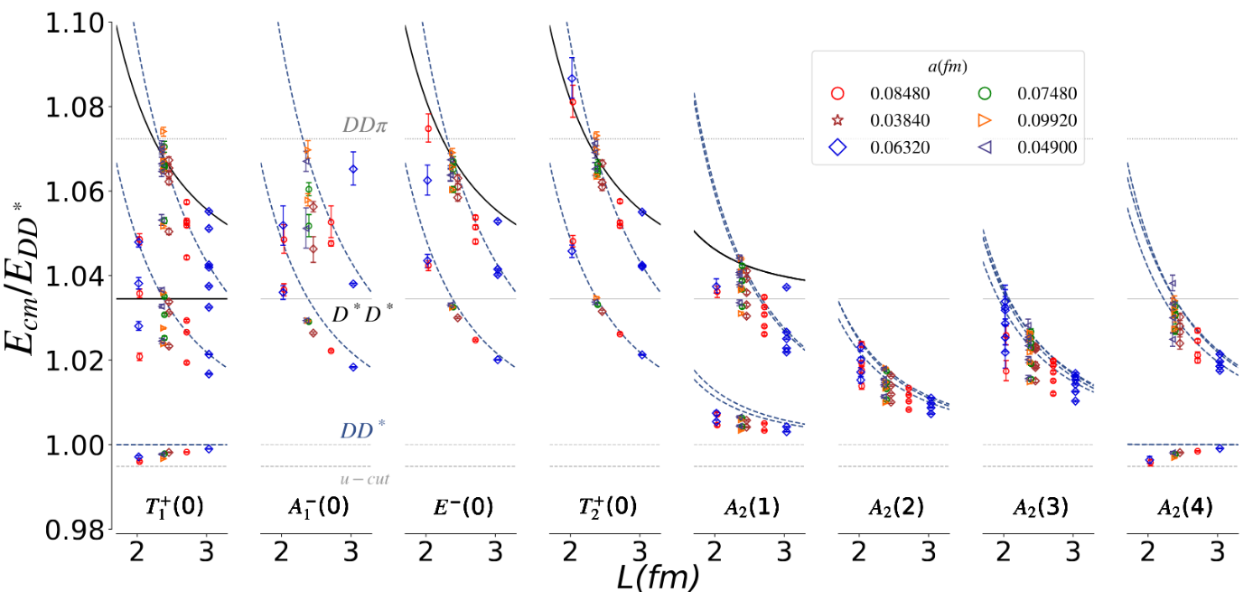 Figure 1: Finite-volume energy levels of the DD* system. The curves represent noninteracting energy levels and the points are the results of the lattice QCD simulations..