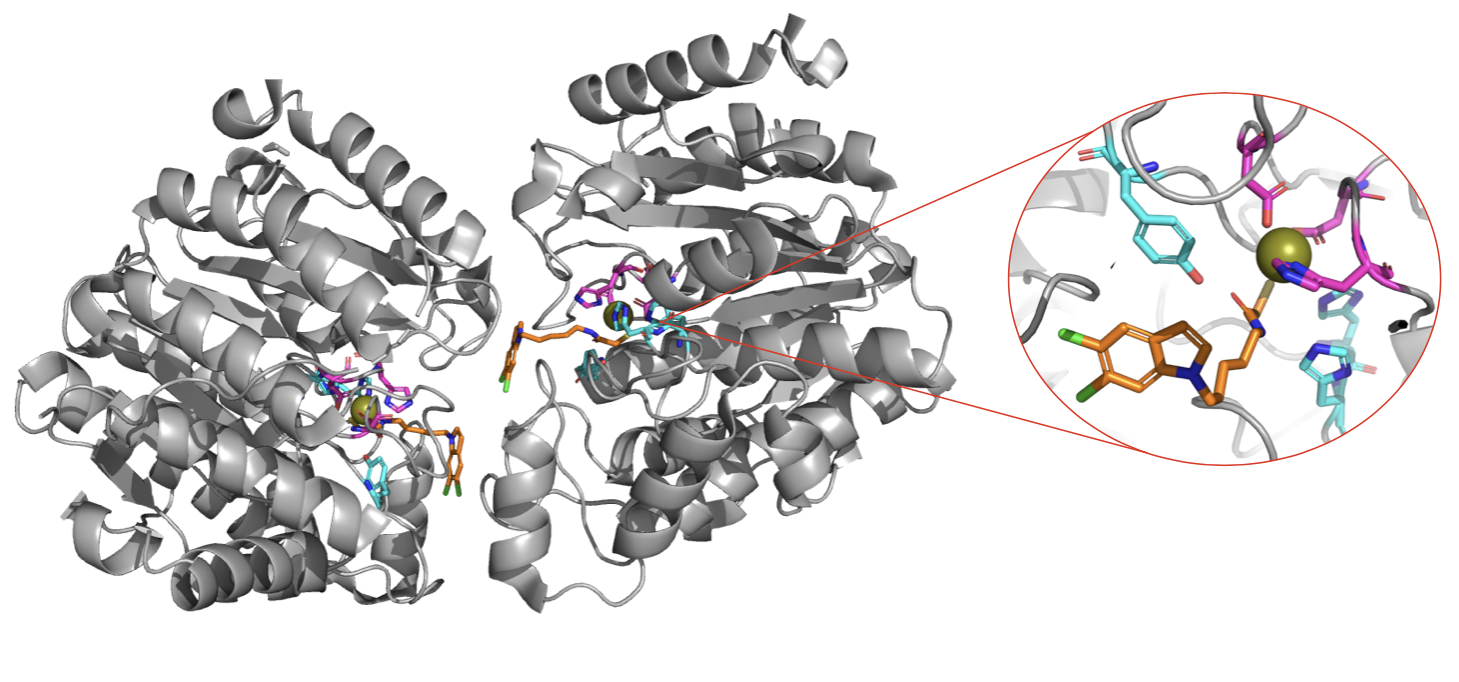 Figure 1. Protein and close up of the Zinc site in chain B of the homodimer. The zinc(II) ion (in gold) is coordinated by Asp 612, His 614 and Asp 705 (in pink). The metal is further interacting with the inhibitor (orange) which is stabilized by Tyr 745, His 573 and His 574 (cyan). In our QM/MM MD simulation, we considered the Zinc site in chain B as the QM region, while the rest of the system was treated classically.