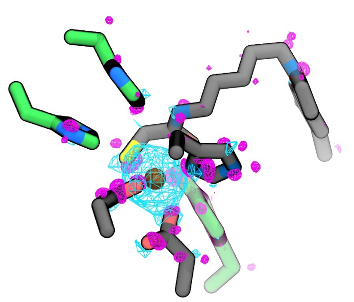 Figure 2. Difference in electron density Δρ=ρ^holo-ρ^apo between the presence and absence of Zn2+ for one QM/MM snapshot. Cyan and magenta surfaces represent an isovalue of +0.004 e / a03 and -0.004 e / a03 respectively. The residues coordinating the zinc(II) ion (in gold) are coloured in grey, while the residues stabilizing the inhibitor are coloured in green.